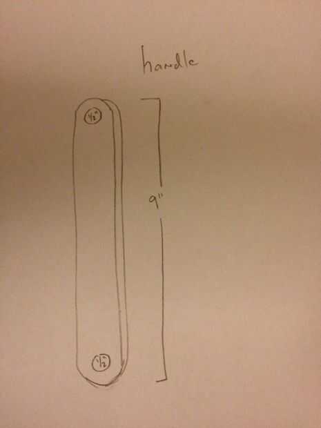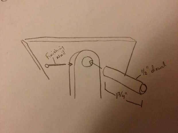 En el otro lado (el otro pie), hice un mango para girar el cuerpo. Tomé una sección de 9 pulgadas de 1 por 2 pulgadas de pino, redondea los bordes con una lijadora de banda y perforó un agujero de 1/2 pulgada en cada extremo. Para el final de esta sección inestable que conectado al pie (la parte superior del dibujo), cortar una sección de 2 y 1/2 pulgada de espiga de 1/2 pulgadas (el tamaño es incorrecto en el dibujo-es no 1 y 3/4 pulgadas) y empujado a través de la parte superior de la empuñadura, la parte superior del pie y el lado del cuerpo. Debe estar al ras con el interior del cuerpo (donde es el contenedor) y fuera de la manija. Use un clavo de acabado por el lado de la parte superior de la empuñadura para evitar que el pasador gire en el mango. También poner un clavo de acabado por el lado de la madera del cuerpo (donde es el contenedor) para evitar que si se hace girar. No coloque un clavo en el pie, el pasador debe girar en los pies. Nota: Si el pasador es apretado en el pie (o cualquier lugar que debe girar libremente), arena algunos de lo agujero para permitir el libre giro.