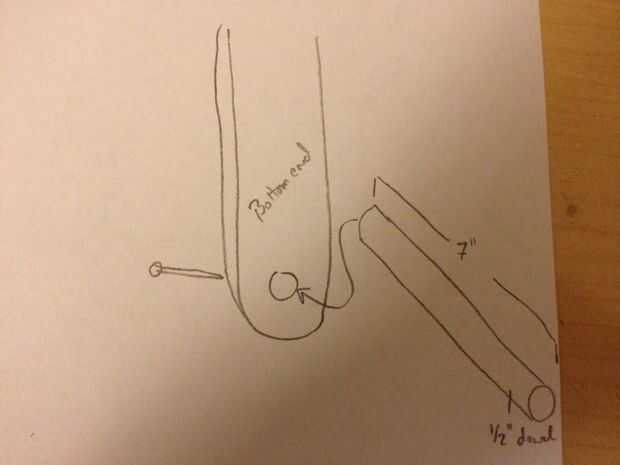 Para el asa real a la biela, corte una sección de 7 pulgadas de espiga de 1/2 pulgada. He pulsado lo en la parte inferior de la biela hasta al ras con la parte posterior de la manivela. Entonces empujé un clavo de acabado a través de mantener si se convirtiera.