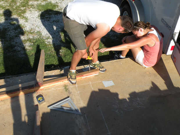 Este método tiene sus puntos débiles; es decir, la cosa tiende a sag, del arco y de la taza con el tiempo ya que hay no hay conectores que van hasta la tapa de tabla. Para resolver este problema, marcar los agujeros de cinco; uno en el centro, uno por cada uno de los conjuntos de las piernas y uno en cada extremo. Dependiendo de la longitud de la broca, broca para taladro de taladro abajo cada pocas capas con un 5/8". Es difícil conseguir perfectamente recta; sin embargo, sé que un taladro y perforar los agujeros en cada pieza primero sería más fáciles, porque todos la alineación sería una pesadilla. Usted puede ver las líneas de lápiz utilizadas para colocar los agujeros en algunas de estas fotos.