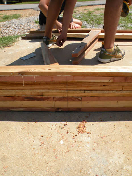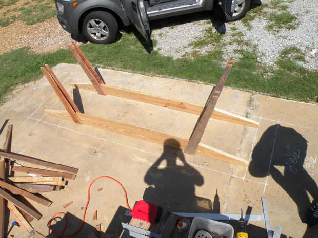 Una vez que has arrancado hasta una gran pila de madera, atropellar algún papel de lija de grano 60-80 de ambos lados para quitar el polvo, la pintura y la arena, que inhibe la adherencia del pegamento. Entonces, comenzando con un caballete u otro, pintar la madera con pegamento para madera amarillo normal (diluido con un poco de agua), ponerla en el caballete y atornillar lo 2 "x 8" con tornillos drywall o madera. Espacio cerca bastante así que un poco de pegamento se exprime hacia fuera de las costuras, y no existen bolsillos o brechas a lo largo de la longitud. Construir la madera encima y alrededor de los extremos de las piernas, bloqueo en su lugar y les impide expulsando a carga.