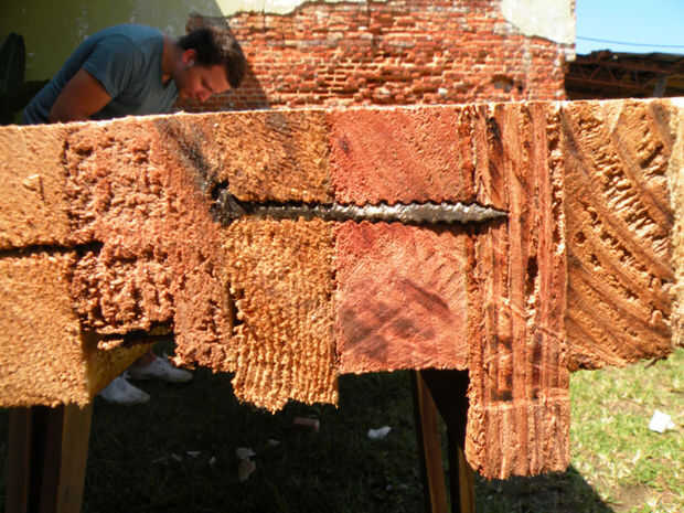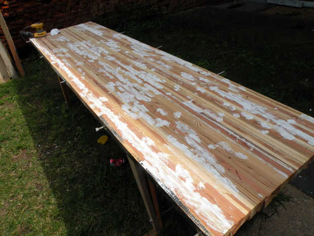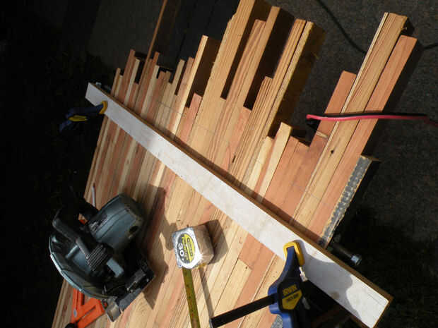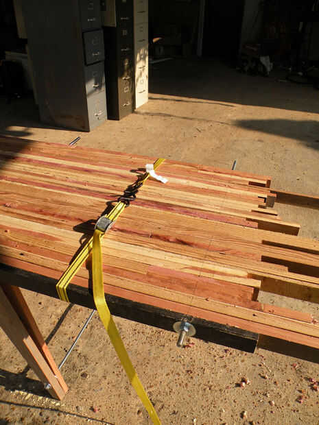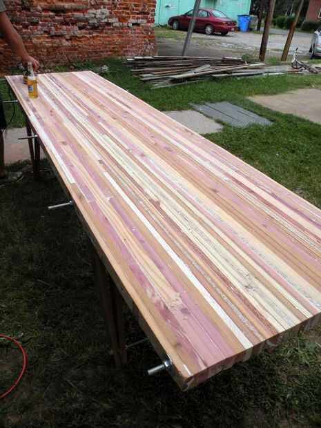 Configurar una cerca con pinzas y una barra de madera para correr una sierra circular contra y recorte los extremos. Puedes ver que corte a través de un tornillo o dos; trate de evitar esto. Pulir con una lijadora de banda, empezando con un grano 80 agresivo o para derribar cualquier más puntos realmente altos. Hacia 100, entonces 120 granos.