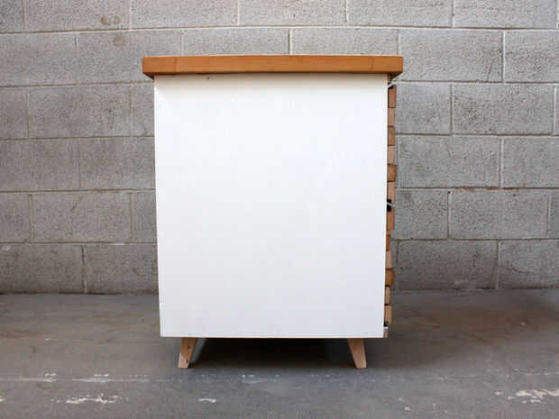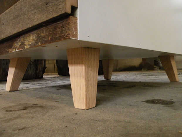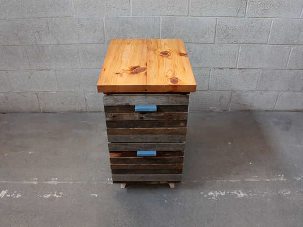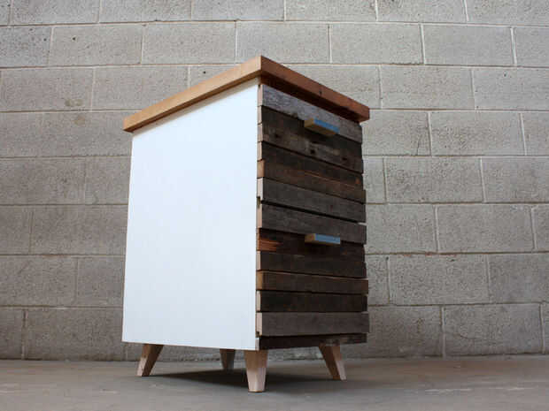 Esta mesita de noche poco guapo estaba hecha de un baño antiguo gabinete, encontrado en circunstancias triste. Con alguna limpieza, reparación, pintura y la adición de cuatro pequeños pies de palet de madera, frentes de cajón de la chatarra de tienda y una tapa de madera laminada, terminé con un hermoso compañero de cabecera por menos de diez dólares en materiales. Chatarra en!
