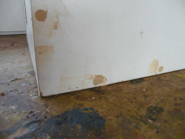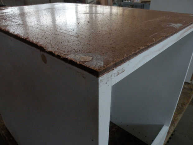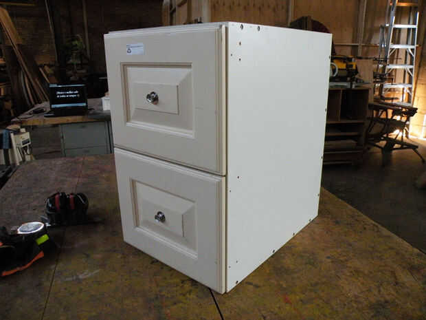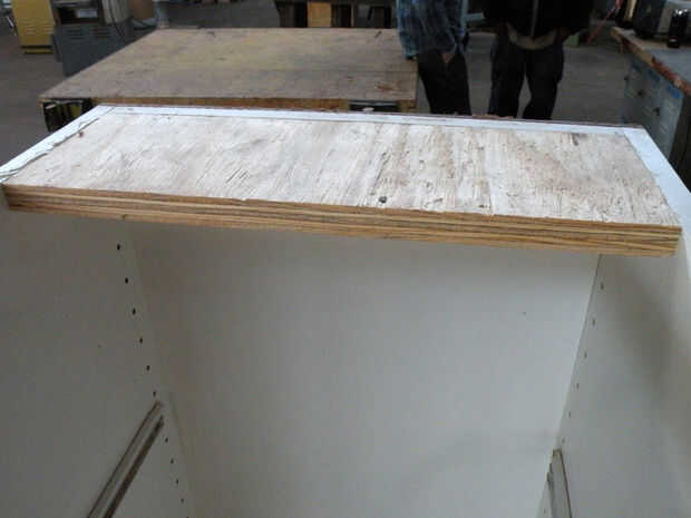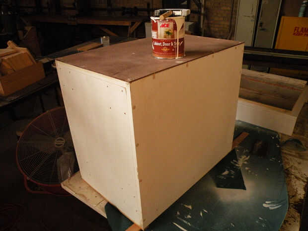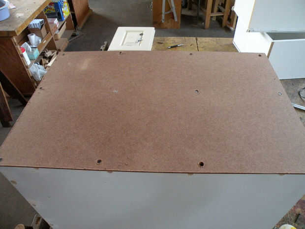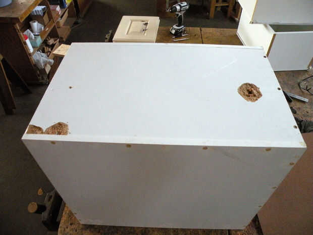 Primero, limpie bien con un limpiador desinfectante. Hubo todo tipo de cosas desagradables en estos cajones, pelo, seda, etc.. Sacar los cajones delanteros, generalmente Unido con tornillos a través de la parte trasera y deseche. Pop los tornillos en donde es necesario ajustar el cuadro. Si realmente es necesario, vuelva a colocar un nuevo--utiliza un pedazo de masonite--con pegamento y tornillos. Añadir camillas de madera contrachapada en la parte superior, si no ya en lugar, cortándolos para caber firmemente.