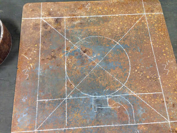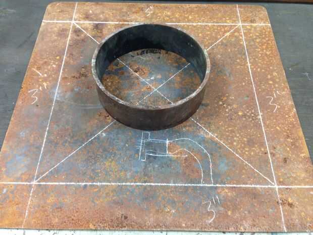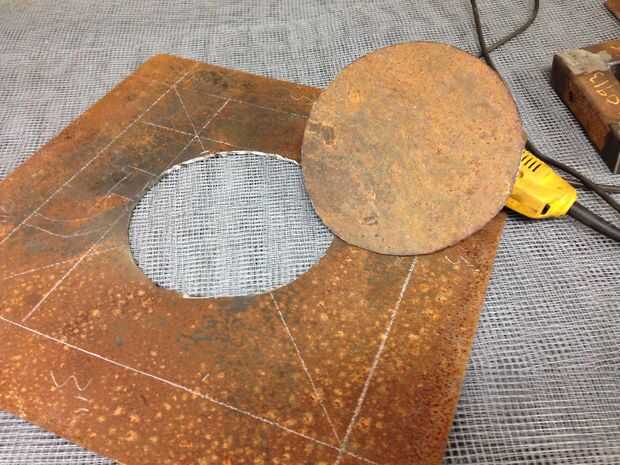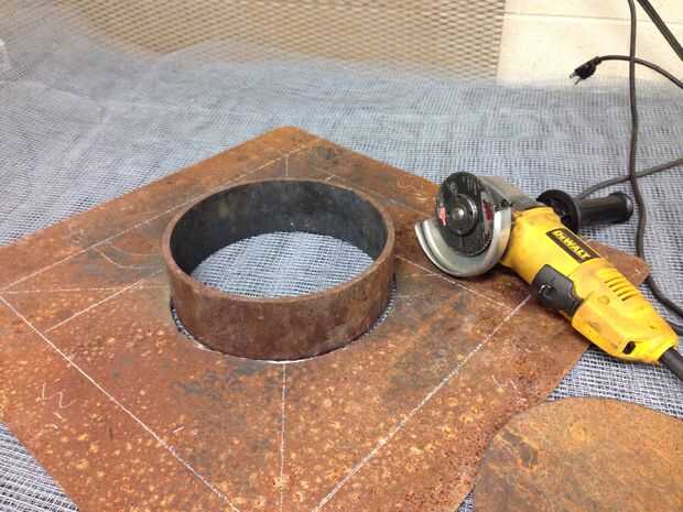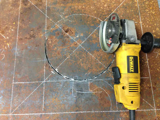 Una vez que el vientre se coloca en la placa, me fui a la amoladora. Nunca había probado cortar un círculo de metal con una amoladora, pero nuestra cortadora de plasma está fuera de Comisión en el momento. Jimmy DiResta me inspiré para esta parte. Él había hecho una plantilla para cortar círculos perfectos con una amoladora. No quiero pasar el tiempo haciendo una plantilla, así que fui solo para él. Sólo tomó unos 10 minutos para cortar hacia fuera.