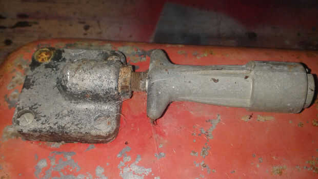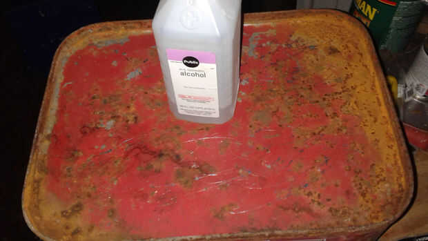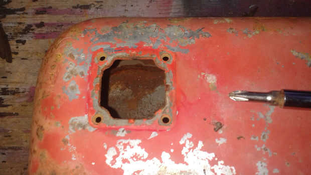 Planeaba cortar el resorte en tiras y colocar en la parte superior de la lata en un puente de madera. Quité el tubo de admisión de la lata de gas con cuatro tornillos. Taladrar los remaches que sostienen la manija y me la quitó. Al revés la lata y me sacudió para quitar tanto moho y la suciedad desde el interior de la lata como sea posible. Había aprovechado la esquina de la poder más cercano al orificio de entrada sobre la mesa para que todo el óxido y la suciedad se acumulan. Luego envuelve la punta de mi dedo con cinta de enmascarar lado adhesivo hacia fuera y acabó con el moho restantes.
