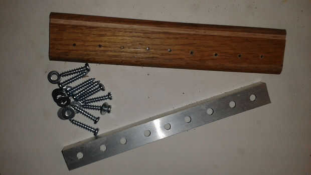 El arpa se refiere a los dientes y el puente de madera que se fijen. Corté un trozo de roble de 1 x 2 (de un marco de cama de agua recuperado que matado hace algunos años) de 8" de largo. He cavado alrededor de mis contenedores de piezas y encuentra una varilla de acero con una protuberancia en un extremo. Fue la lengüeta para cerrar el desagüe en un grifo de lavabo. Esto actuaría como una tuerca de las cuchillas en. Una sección de canal U de aluminio de una muestra de yarda de la compañía de seguridad se convertiría en la barra de presión para mantener los dientes en su lugar.