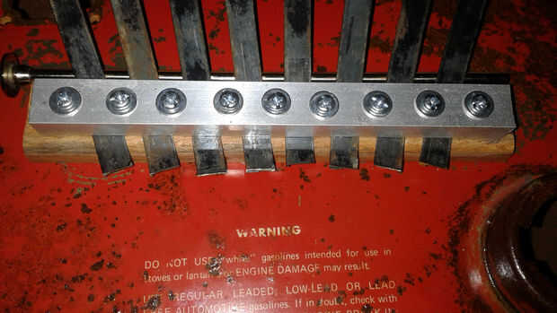Al día siguiente templó el cuadro de rumba. Usé un programa shareware en mi portátil con un micrófono de calidad. Aflojó los dientes ligeramente por lo que se podría deslizar hacia adelante y hacia atrás un poco y ellos atentos uno a la vez. Las notas comienzan en el centro e ir alternando hacia izquierda y derecha. Atentos a mi menor, por lo que el arreglo de la nota es D, B, G, E, F #, A, C y E2. Tuning es bastante recta hacia adelante-hacer el diente más corto para subir el pitch o más para bajarlo. Puedo ayudar a amortiguar las otras púas con cinta de aislar a la nota deseada. Una vez que los dientes fueron afinados apretó los tornillos con cuidado para mantener incluso la presión y evitar traqueteos y vibraciones no deseadas. Las partes posterioras de los dientes pueden ser suelo liso con una herramienta Dremel, pero dejé mi áspero y había cubierto los extremos desnudos con una tira de cinta adhesiva. De esta manera puedo quitar la cinta y bajar el tono del instrumento entero unos pasos si quiero.