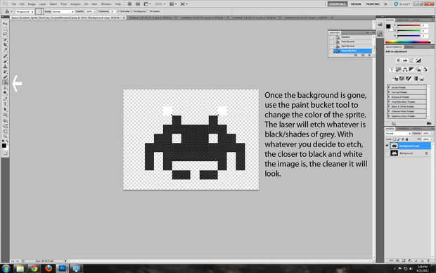 Una vez desaparecido el fondo, utilice la herramienta Cubo de pintura para cambiar el color de lo sprite. El láser grabe sea negro/tonos de gris. Con lo que decide grabar, el más cercano a blanco y negro que es una imagen, más limpio que se verá.