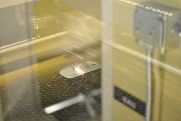 Después de un par de pruebas en el mismo metal, finalmente marcado abajo los valores a 90 poder y velocidad de 10 en uno de nuestros cortadores. Sin embargo, ya que estas máquinas tanto uso no dependen de estos parámetros para ser perfectos, la energía puede cambiar de semana a semana como la máquina lleva abajo y recibe mantenimiento. Lo que buscas, es una superficie negra sólida en el área del diseño. Usted puede notar algunos parches como es grabado y que es incorrecto y se salen cuando vas a deshacerse del exceso spray.
