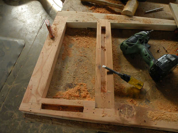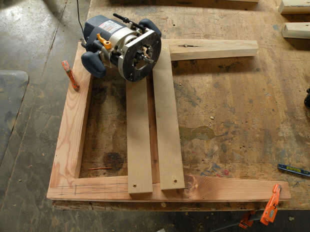 Encontrar algún material fino para usar como una guía. Corte a tiras rectas en una sierra de mesa. Tornillo o abrazadera en su lugar a lo largo de sus marcas. Usar una fresadora de descenso vertical y tapa de cojinete poco para cortar las ranuras de 3/4" de profundidad. Cuadrado de las esquinas con un cincel.