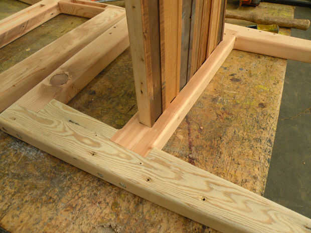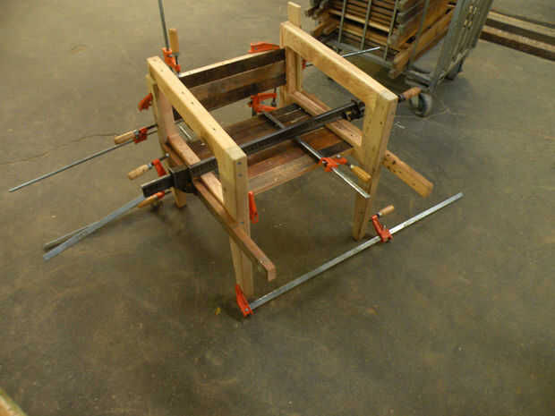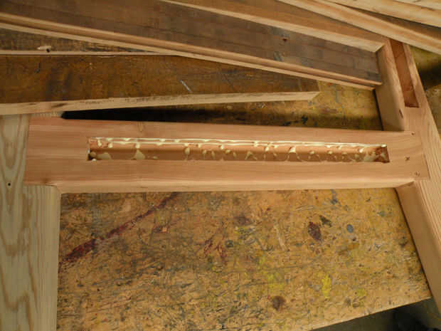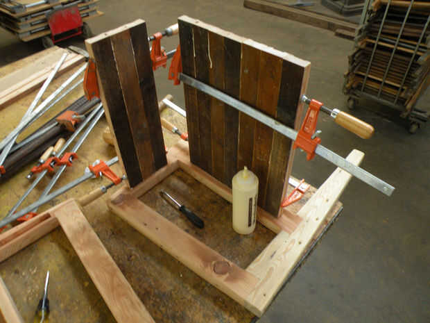 Poner más pegamento en las otras ranuras y un martillo que enmarcan a las placas de asiento y respaldo. Sujete el infierno fuera de él. Unos tornillos pequeños, cabeza de corte a través del marco y en el asiento del estallido en cuatro fuera de esquinas para la fuerza adicional.