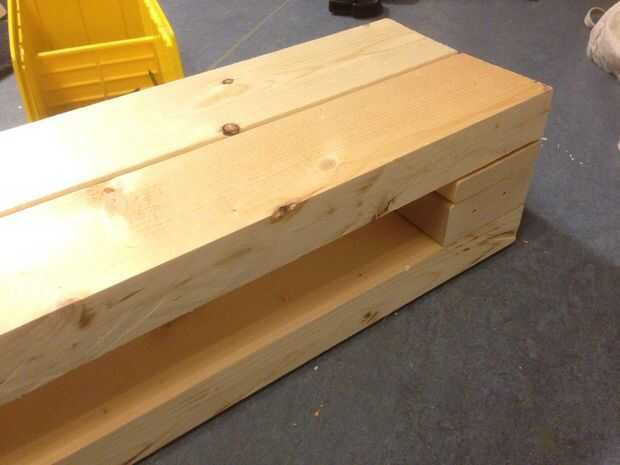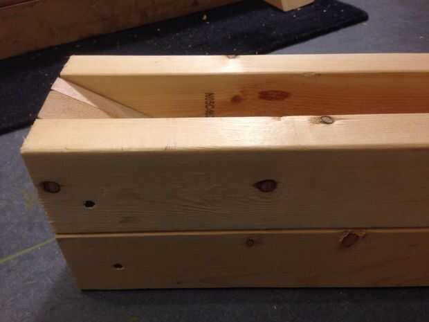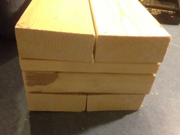 Coloque dos de las piezas laterales juntos y paralelos entre sí, luego coloque los espaciadores encima de ellos en cada extremo con el lado ángulo inclinado hacia el interior y alineen los bordes exteriores. Colocar los otros dos laterales en la parte superior los espaciadores para completar el sandwich.