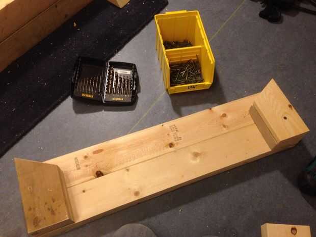 La forma más fácil para esto, es a arrodillarse justo en el sándwich (con cuidado manteniendo las cosas alineadas). Comience en un extremo y usando los tornillos más largos, atornille a través el lado superior en el espaciador y luego en la pieza inferior del lado del espaciador. Hacer lo mismo en el otro extremo de este lado se voltea todo, realinear cualquier cosa que se moviera fuera de lugar y atornillar las dos esquinas de la misma manera.