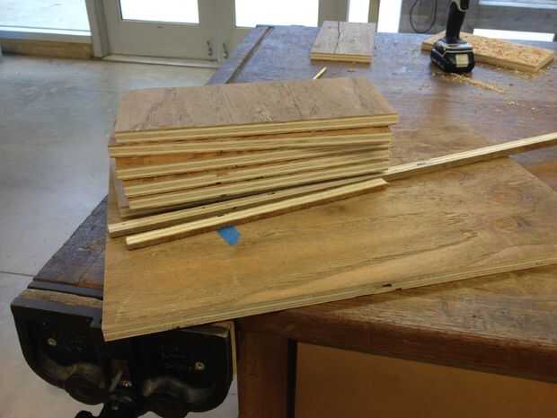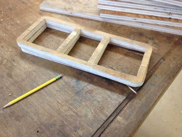El cuadro consistía en 9 piezas de madera contrachapada de 3/4 pulgadas laminados juntos, 7 de los cuales eran hueco en 3 compartimentos. Cada pieza es de 6 x 15 pulg y han redondeado los bordes. Para hacer este corte a los 9 de sus piezas en una sierra de mesa o sierra de panel. Conseguirlos todos idénticos antes de redondear las esquinas de cada piezas. Los cantos use una lijadora de disco y roca constantemente la esquina hacia atrás y hacia adelante. Hacer esto para todas las nueve piezas, pero luego conjunto a un lado dos de ellos para hacer la parte superior y parte inferior del altavoz.