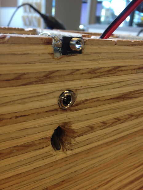 Este paso fue un poco difícil para mí y para mis altavoces. También sus maneras de insertar los botones varían especialmente si tienes botones diferentes, pero se trata de cómo mía. Puesto que las paredes de madera contrachapada son relativamente gruesas es difícil utilizar las tuercas incluidas con las tomas. Así que tuve que idear otro método para cada uno. Así que para la toma de audio usted debe cuidadosamente Cincele una muesca para se siente. Asegúrese de que sea lo suficientemente grande como para caber las clavijas y los cables soldados a él. Hacer grande lo suficiente como para que no toquen los cables, si lo hacen realmente cagarla tu sonido. Luego caliente pegamento en lugar y también utilizar pegamento caliente para llenar el espacio donde están los cables y aislarlos.