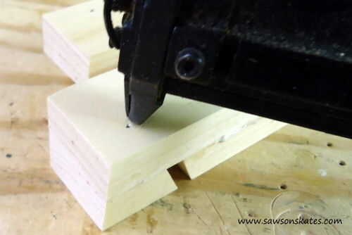 Coloque el soporte delantero superior. En la parte superior atrás rodillera todavía en la mesa de trabajo, Aplique pegamento en el lado corto del soporte frontal superior, portaobjetos en la parte inferior largo asegurándose de que los bordes queden al ras con el soporte superior y fíjela con clavos de 1-1/4.