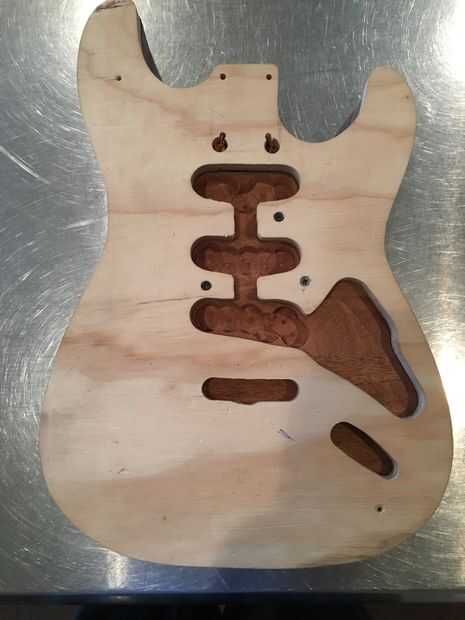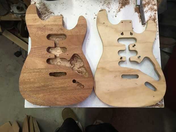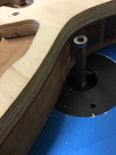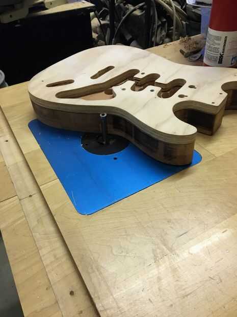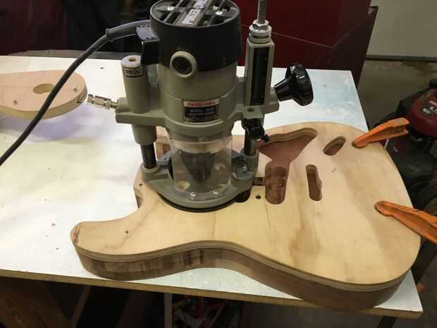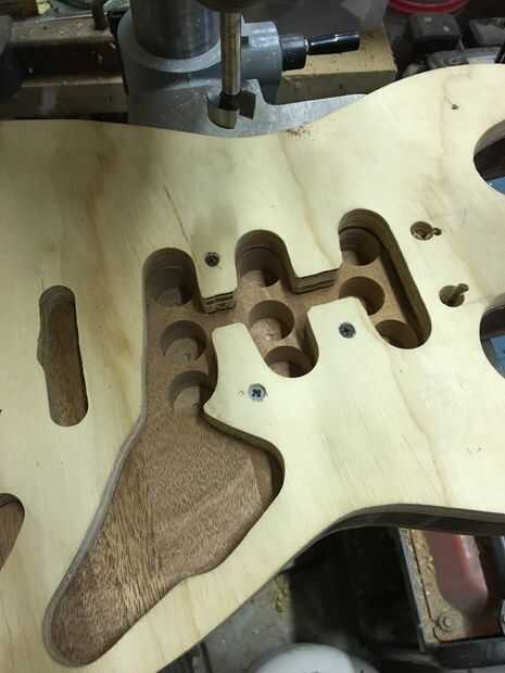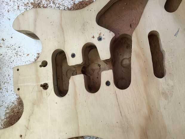 Para este paso, usted debe tener mucho cuidado. Dependiendo del modelo, routers pueden girar a velocidades de más de 20.000 rpm. Además, si utiliza cinta de doble cara, asegúrese de que aplicarlo correctamente con mucha fuerza. Utilice cinta más de lo que crees que necesita para la buena medida. Cuando se rutea, el cuerpo debe ser no más de un 1/16 de pulgada más grande que la plantilla en cualquier momento. Si el cuerpo es demasiado grande, usted quiere a la arena de lo contrario, el router tendrá que sacar más material. Menor será la cantidad de material el router debe quitar, mejor. Si se intenta desprender demasiado material a la vez, se producirán problemas tales como chip a quemaduras y recalentamiento de la broca de fresadora. Algunas de estas cosas también pueden ocurrir si intenta hacer demasiado rápido. Existen soluciones; Si vas a pintar tu cuerpo de guitarra, puede rellenar fichas y gubias con Bondo. Puede tomar tiempo pero quemaduras se pueden enarenar hacia fuera. Lo peor de las tres es la broca de fresadora recalentamiento; Esto puede opacar la hoja y causar otros problemas. Una vez hecho el trayecto, las cavidades de control pueden dirigir y es donde residirá la electrónica. Desea quitar tanto material como sea posible con los pedacitos de forstner.