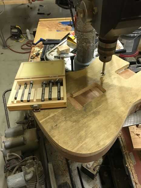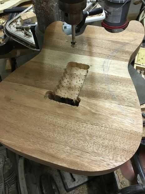 El siguiente es la cavidad del trémolo, donde se encuentra el mecanismo; un trémolo es una serie de resortes que mantienen el puente contra el cuerpo. Cuando se aplica fuerza a la palanca, afloja las cuerdas, que cambia el tono de la nota (ver diagrama anterior). Usted también querrá esto de la derrota, o utilizar los pedacitos de forstner. Para la demostración, utilicé brocas forstner para cortar la cavidad.