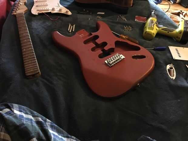 El final es una parte muy importante del look total. Elegir un color que disfrutará en su guitarra. Antes de que la pintura, tenga cuidado de llenar los poros y huecos en la madera ya sea con un sellador de lijado, también conocido como llenado de grano. Para imperfecciones mayores, usar bondo. Dar tiempo suficiente para secar según las instrucciones del producto. Lije con grano 220 a un acabado liso. Después de limpiar limpio, es hora de pintar. Utilizo pintura acrílica en una pistola, pero puede utilizar pintura en aerosol o pintura a base de aceite. Déjelo secar a las instrucciones del producto. Entre cada capa de pintura, lije con un papel de grano de alta (600-1000 grano) y vuelva a pintar. Número de capas depende de la preferencia, tipo de pintura y color. Por ejemplo, rojos toman más capas para cubrir. Una vez que esté satisfecho con la cobertura, lije con un papel de grano muy fino (grano 800-2000) para deshacerse de la apariencia de cáscara de naranja. Si después de lijar, aún tienen la textura de cáscara de naranja, añadir otra capa y repetir. Una vez que el acabado es perfeccionado, puede empezar a aplicar laca. Si quieres un acabado mate, ir con una laca mate. Para un acabado de espejo, utilizar una laca de alto brillo. Entre cada capa de barniz, lije con una lija de grano 2000, comprobando cualquier cáscara de naranja. Continúan de la arena y la laca hasta que se ha ido o mínimo. Esto llevará a 5-7 capas de laca para un acabado fuerte y claro.