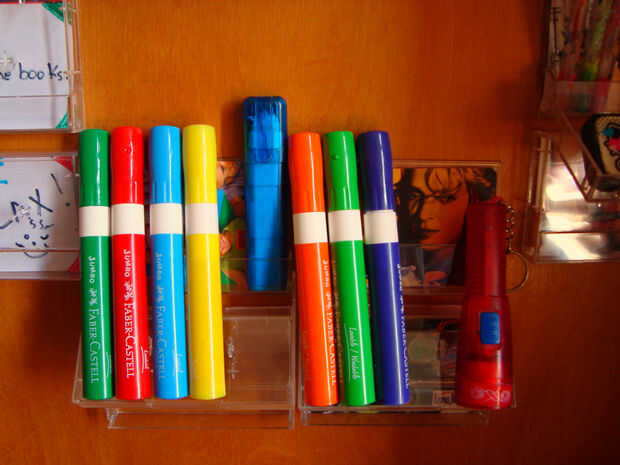 Casos de cintas de cassette son excelentes para organizar pequeñas cosas.Son perfectas para sostener lápices de colores, porque puedes ver los colores a través de las cajas y cuando se abre un cuadro, construir un cómodo soporte de lápices de colores