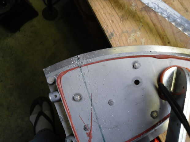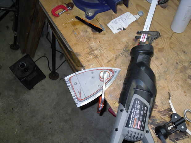 Con las líneas dibujadas Sujete la plancha a su banco de trabajo con la base colgando sobre el borde. Use la sierra para hacer una muesca de arranque. Luego use su sierra alternativa para cortar la plancha a lo largo de la línea horizontal.