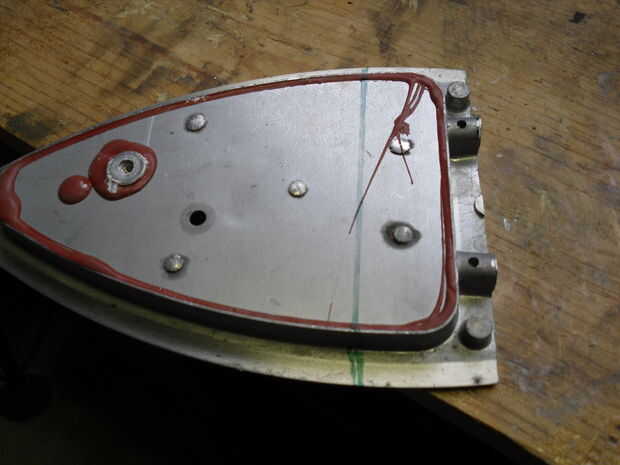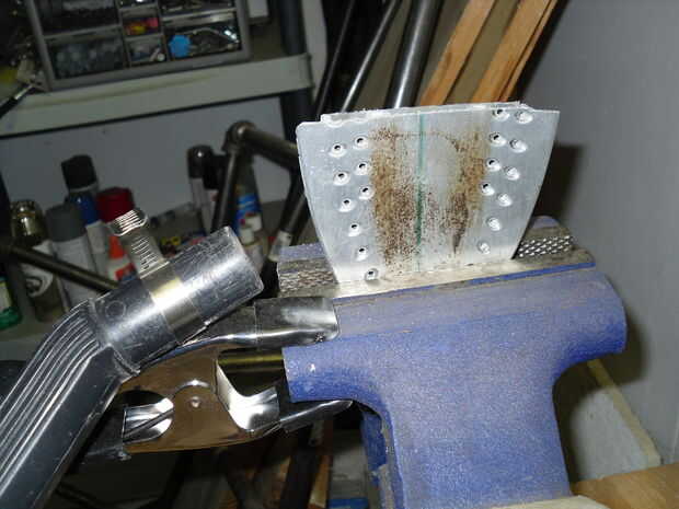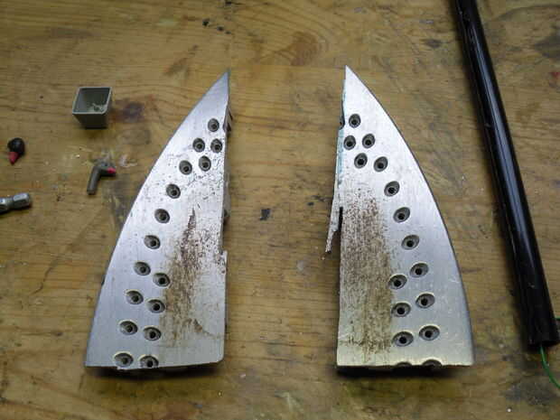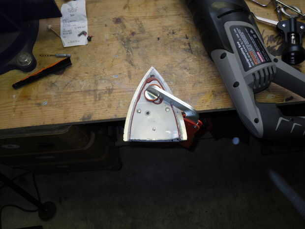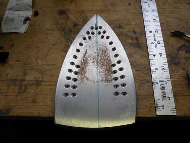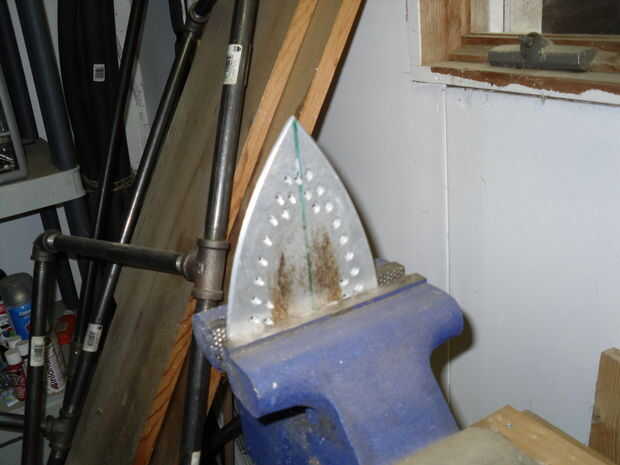 Cuando termine el corte horizontal de transferencia la plancha a su mordaza. Hacer una muesca de arranque en la parte superior de la plancha con una sierra y luego utilice la sierra alternativa para cortar la plancha hasta llegar cerca de la prensa. Cuando ha cortado el hierro lo que se puede reorientar el hierro en la mordaza para que la base quede mirando hacia arriba. Ahora termine el corte desde el lado de la base de la plancha. Tenga cuidado al hacer este corte, como movimiento de la sierra alternativa se desprenda del metal delgado en la parte posterior de la plancha y podría ir volando. Se recomiendan gafas de seguridad y una máscara antipolvo.