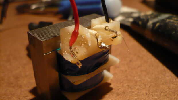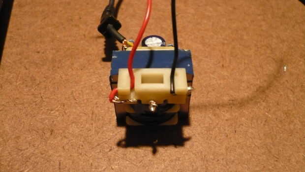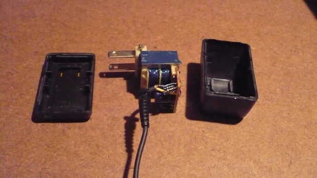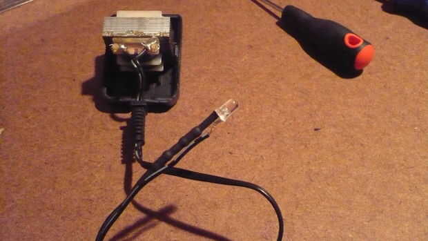 Después de retirar la unidad rectificador, desoldar las puntas que van en la salida y dos nuevos cables a los terminales de soldar. A continuación pegamento caliente los terminales para asegurar que no se rompen los cables de la bobina del rectificador. Finalmente cortar el cable largo a la longitud correcta (aproximadamente 1-2 pulgadas), empalmar los extremos y soldar el LED. Nota: el cable positivo (+) desde el cargador de pared debe tener una raya blanca corriendo por la longitud de la misma para indicar su polaridad. Los largos de la pierna de su LED es el positivo (+).