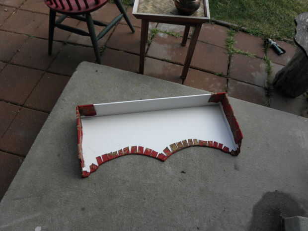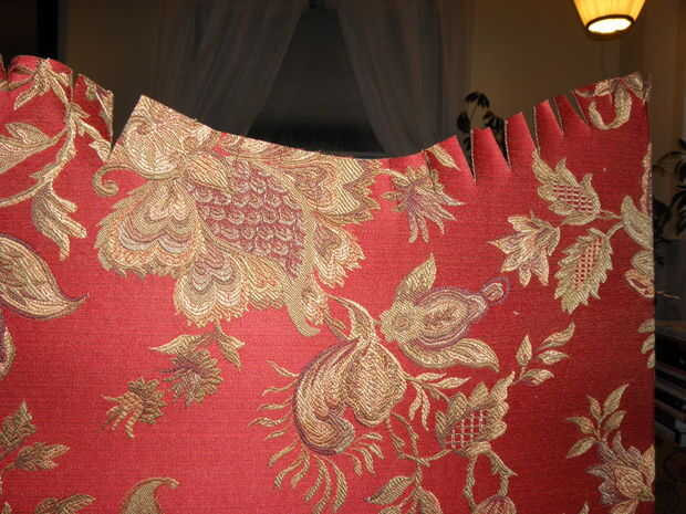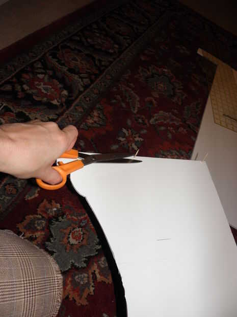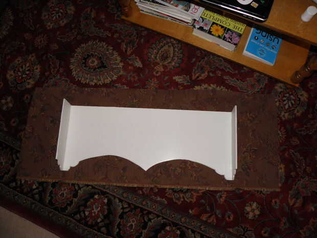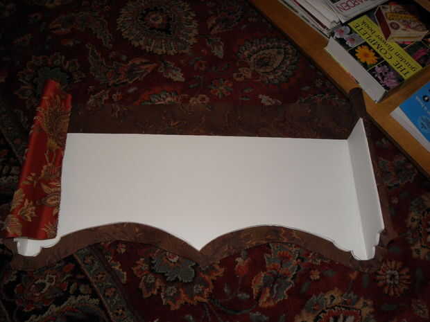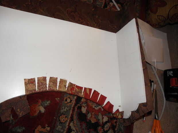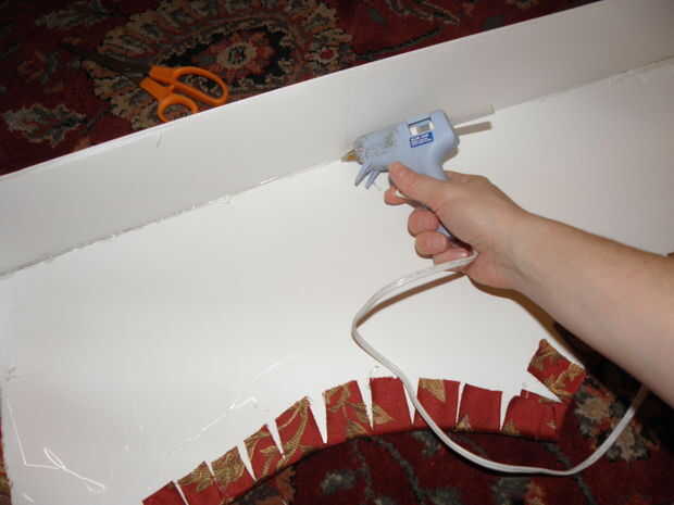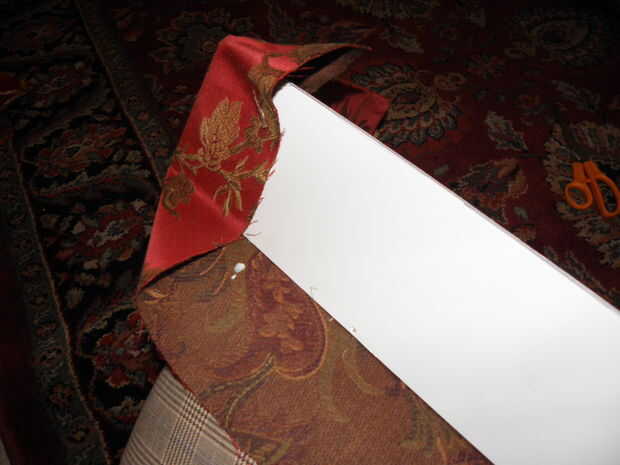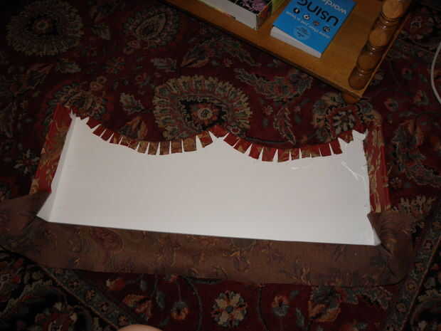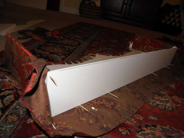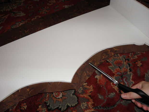 7. trim para y sus curvas y esquinas. Ahora que se cubre la superficie de la cornisa, recorte cualquier bit de lejos que es excesivo. Para mí esto significó cortar los pedacitos redondeados abajo por lo que hubo alrededor de 1,5 pulgadas de proyección de tela. Entonces, cada pulgada o así, corte para dentro de aproximadamente 1/4 de la Junta. Si usted no tiene brocas redondas o curvas y está haciendo un cuadro de cornisa perfectamente rectangular, puede probablemente salirse sin recorte en todo y simplemente Envuelva su caja como un regalo.