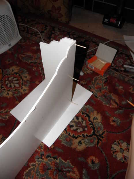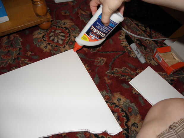 4. pegan todo! Te recomiendo a Elmers pegamento y palillos de dientes para comenzar. Simplemente aplique una tira a lo largo de los bordes que está poniendo juntos y mantener en su lugar por empujones algunos palillos de dientes de la parte delantera en el lado del espumoso. Caliente podría pegar esto si querías pero encontrar pegamento caliente es resistente y derrite la base de la espuma. También, parte del encanto de cajas ligeras de la cornisa es que la tela se mantienen unida una vez que todo está dicho y hecho.