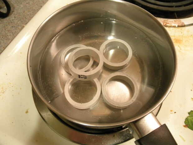 Utilicé una cacerola pequeña para llevar agua a bajo punto de ebullición. He leído en dos áreas diferentes que el "punto de fusión" o maleabilidad punto de PVC es como 170-190 grados F. Así que con eso en mente lentamente a calentar el agua y llevar el agua hasta justo antes de hervir. Cada una de sus piezas de círculo en la gota y esperar a calentar.