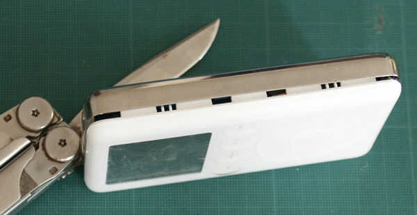 esto no podría ser más simple. Cuchillo en conjunto a lo largo del lado largo del caso. Siempre tan levemente la cuña encima de la parte posterior de metal de la caja. Presione hacia abajo el plástico con el cuchillo y alentarla a abrir en un movimiento de palanca.