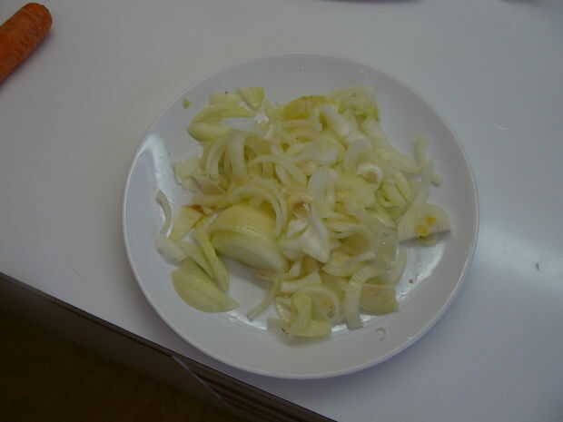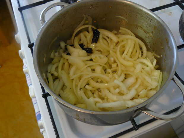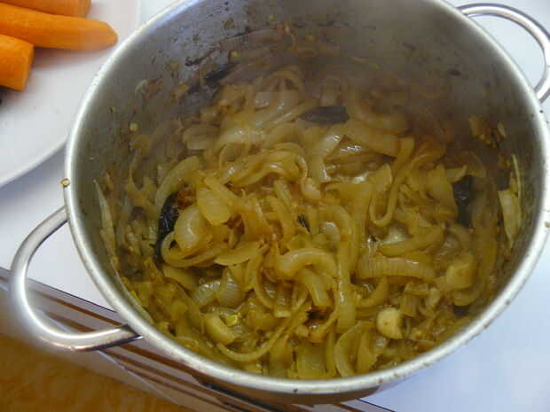 Picar la cebolla (trozos más grandes son aceptables, como cocinará durante mucho tiempo de todos modos) y chiles secos. Calentar 1 cucharada de grasa en la olla (que debería estar vacía ahora) y sudar la cebolla y la guindilla. Usted puede dejarlos marrón ya para dejarme "la quema", si esa es la manera que el rodillo. Les reservamos a un lado.