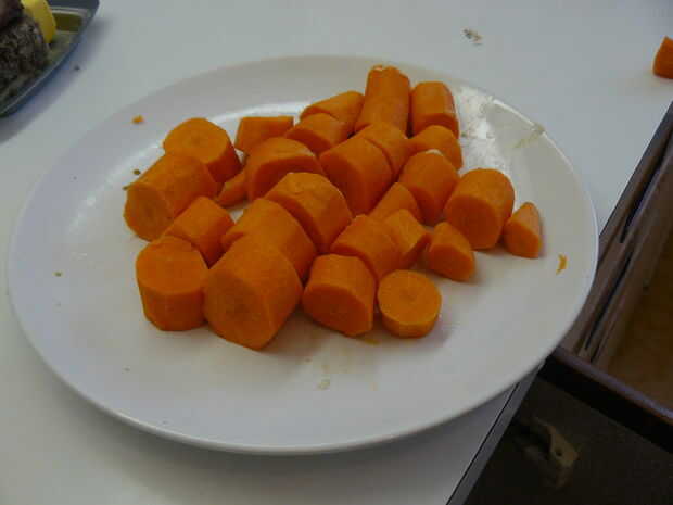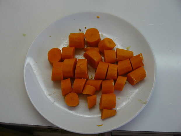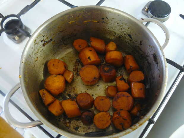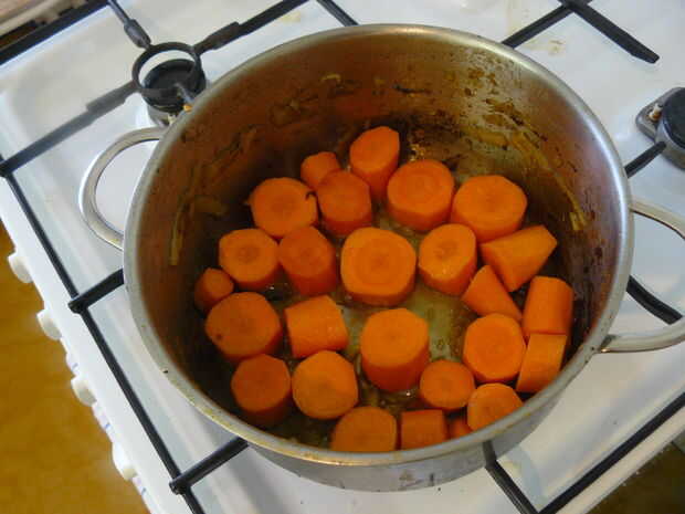 Pele aproximadamente picar las zanahorias, calentar 1 cucharada de grasa en la olla vacía y que partido duro. Realmente desea dejarlas caramelizar para deshacerse del sabor vegetal y déjelo adquirir sabor carnoso somwhow.