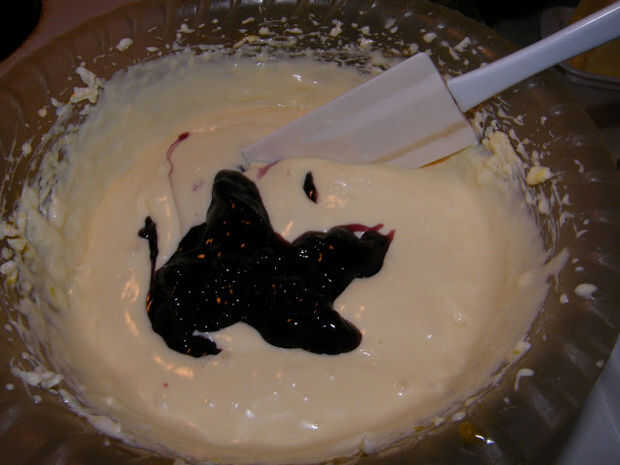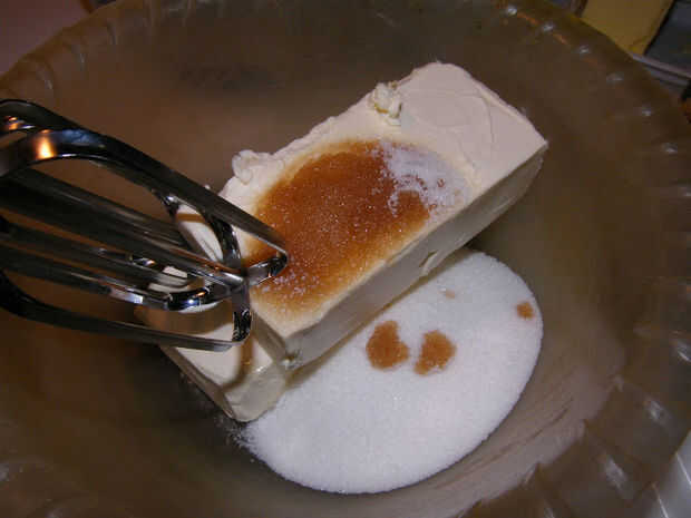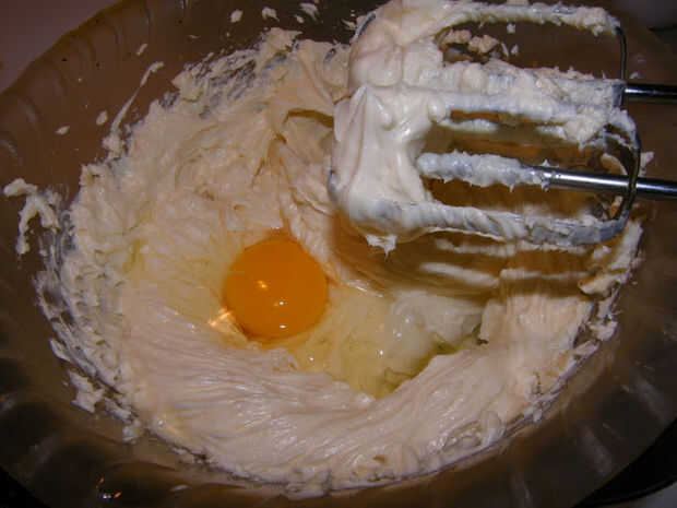 Mezclar el queso crema, azúcar, vainilla hasta suave y cremosa. Agregar los huevos (uno a la vez) y mezclar bien.
