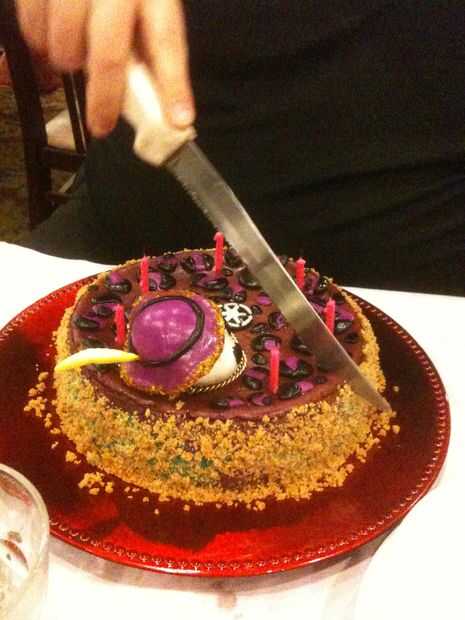 Fuimos a una barbacoa brasileña y había traído el pastel en el restaurante el día de, y almacenaban en su nevera. Cuando llegaron sus amigos, y estaban todos festejando hecho, tuve el camarero sale con el pastel y sorprenderlo. :)