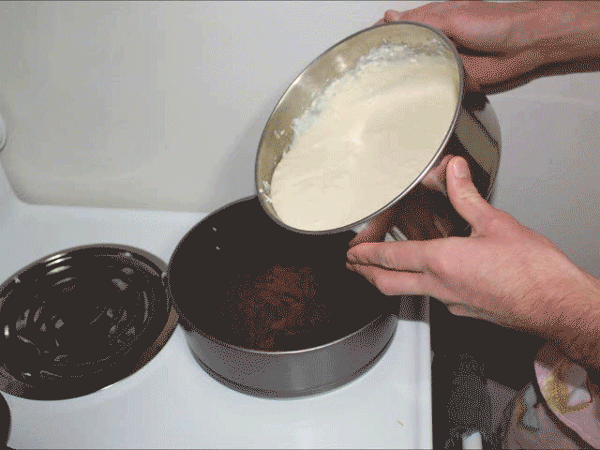 Vierta el cheesecake relleno directamente encima del brownie. Casi debe llenar la bandeja en una capa lisa. Debería haber alrededor de una pulgada entre la parte superior del relleno y la parte superior de la bandeja. El relleno se expandirá un poco, pero no subir demasiado.