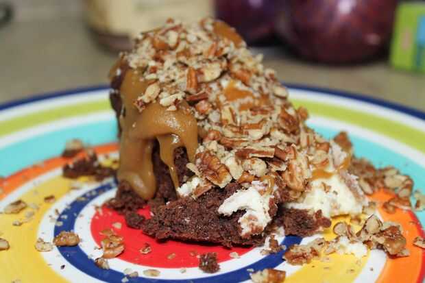 cacahuate & Brownie CheesecakeTiempo de preparación: 45 minutosTiempo de cocción: 30 minutosTiempo total: 1 hora y 15 minutosIngredientes 1 caja de mezcla de Brownie Fudge (agua, aceite vegetal y junto la mezcla de huevo)3/4 c. caliente fudge helado