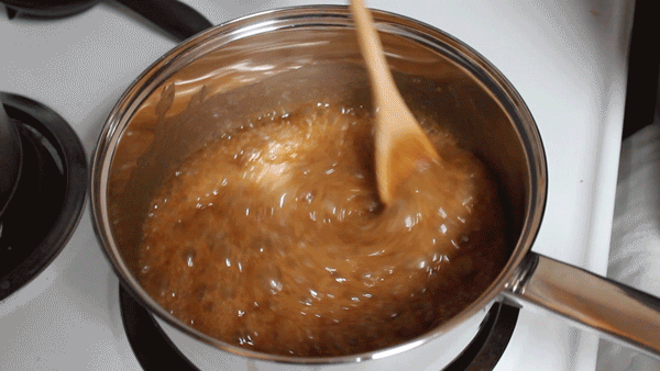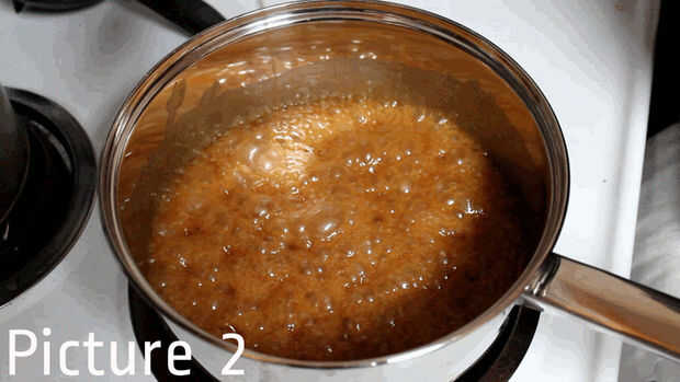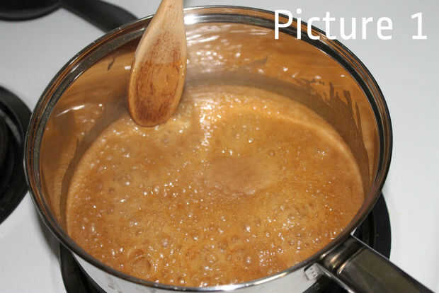 Mezclar todos los ingredientes en una cacerola mediana media baja a fuego medio. Cocinar removiendo suavemente durante 7-8 minutos, hasta que más gruesa. Habrá un cambio de color distinto cuando la salsa ha caramelizado. Retirar del fuego. Cuadro 1 demuestra la salsa antes del cambio de color. Cuadro 2 es cómo se verá después de ha cambiado de color.