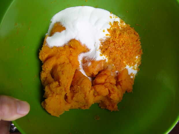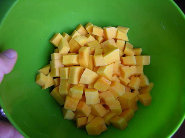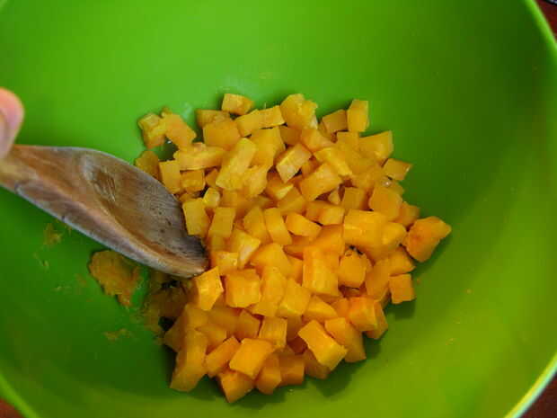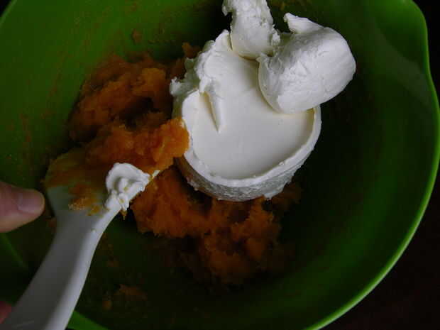 Pelar la calabaza, cortar en cubitos, microondas, destapado, sin agua, hasta que muy tierna. (Mina tuvo tres ráfagas de 5 minutos de cocción, revolviendo entre.) Dejar hasta que el frío, al descubierto. El secador lo cocido aplastar mejor. (Si cualquier residuo de agua, vaciarlo).