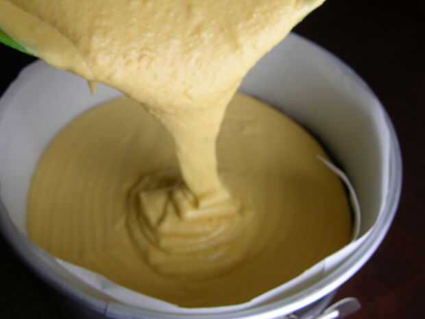 Línea interior de la lata con una banda de papel de pergamino, vierta el relleno.