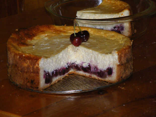 Batir las claras de huevo hasta montarla e incorpore a la mezcla. Esparcir la mezcla de un poco sobre la corteza y espolvorear con las nueces picadas. Lugar de cerezas en la parte superior las tuercas luego vierten la mezcla de queso entero.