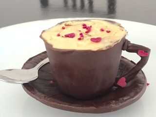 Es una taza y plato totalmente hecha de chocolate y comestibles y está sellado para adjuntar una ganache cheesecake de fresa. DELICIOSO!!!