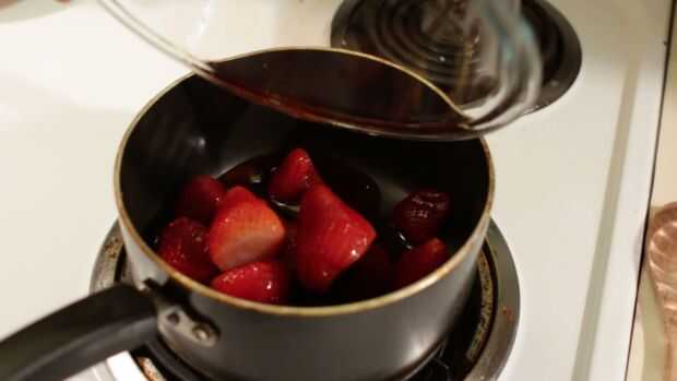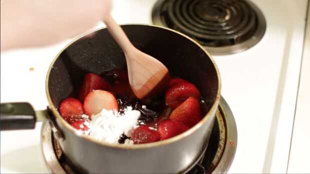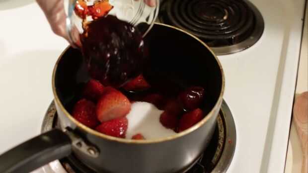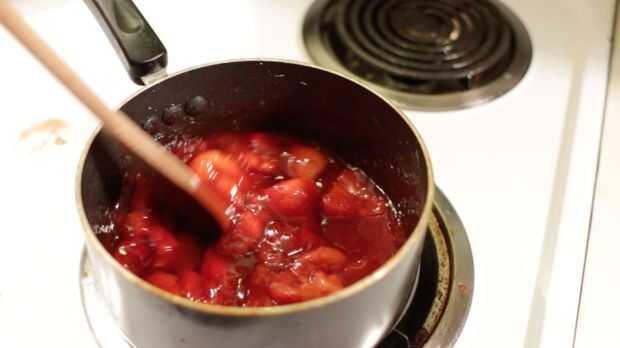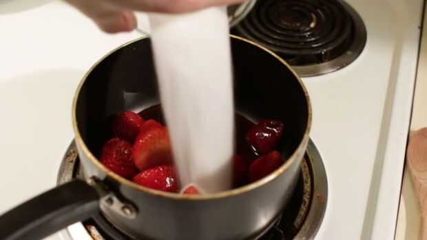 Ahora es el momento para hacer nuestra salsa de fresa. O si quieres ir aún más fácil, simplemente comprar algunos rellenos de pastel de cereza y utilice para su cobertura. En una olla, agregamos nuestra fresas, azúcar, gelatina y almidón de maíz. A fuego medio revuelve periódicamente hasta que la gelatina se derrita completamente. Ahora en este punto se puede dejar la salsa como es y chill, con grandes trozos de fresa o ponerlo en la licuadora, que es lo que me gusta hacer.