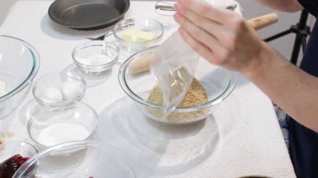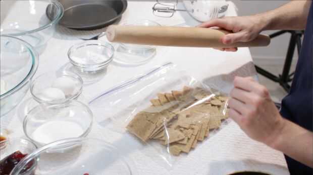 Primero precalentar el horno a 350 grados F. Ahora vamos a aplastar a nuestras galletas. Voy a hacer esto en una bolsa cerrada de zip y utilizar mi pin de balanceo y batirlo. Sin duda se puede utilizar un procesador de alimentos si lo desea, a veces utilizo mi procesador de alimentos. Entonces vamos a poner las migas en un bol.