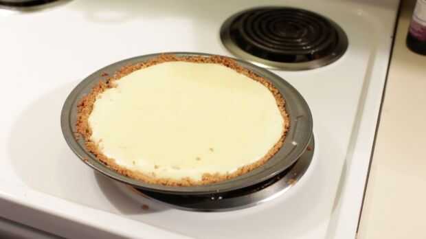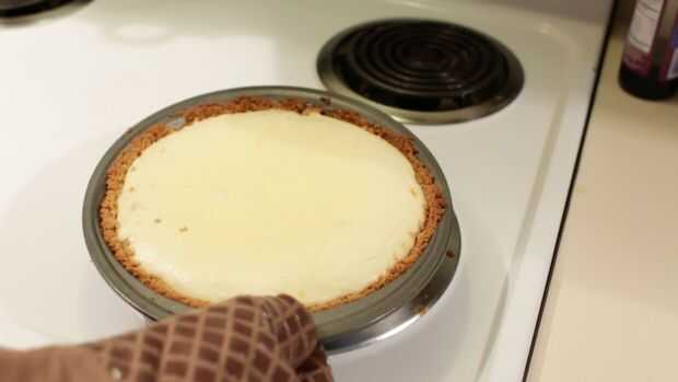 Después de 20 minutos comprobamos nuestra tarta de queso. Buscar en los bordes, si están recibiendo demasiados, hacer un escudo de corteza de papel de aluminio y cubra los bordes, luego lugar de nuevo en el horno para hornear por 10 minutos más. Cuando sacarlo y probar y lo meneo, habrá sólo un ligero vaivén en el medio. Es cómo sabes hacerlo. Ahora permita que se enfríe la estufa o contador para aproximadamente una hora. Luego coloque en el refrigerador y enfriar por lo menos una hora. Es mejor dejar allí más de largo sin embargo.