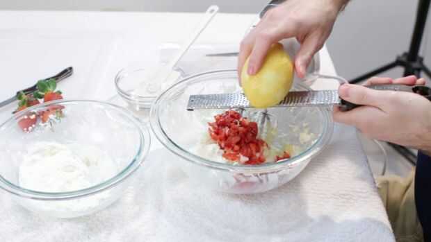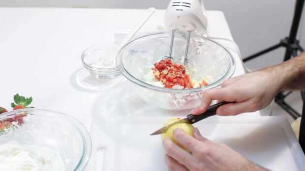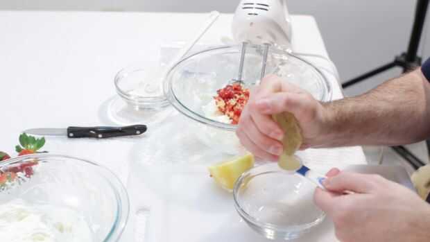 A continuación añadimos nuestro extracto de vainilla, fresas en dados, ralladura de limón y el jugo de limón.
