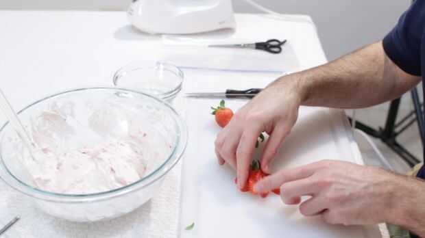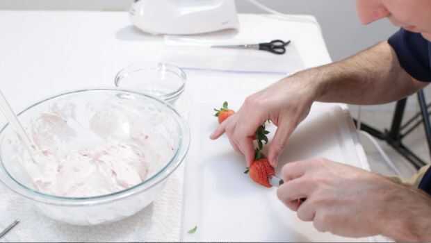 un simple pastel de chocolate rico cubierto de fresas dulcesPaso 1: ingredientespara la esponja:175g de mantequilla175g de azúcar impalpable3 huevos medianos175g de harina self-raisingpolvo de coco 1tbspara el glaseado:175g de chocolate125g de manteq