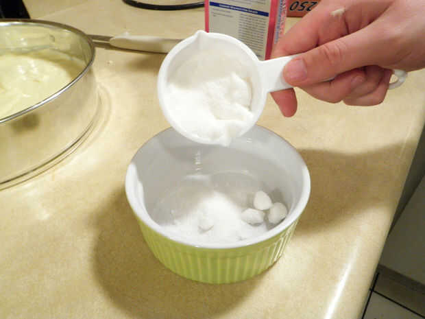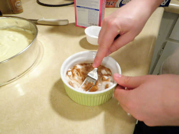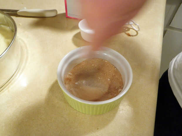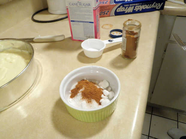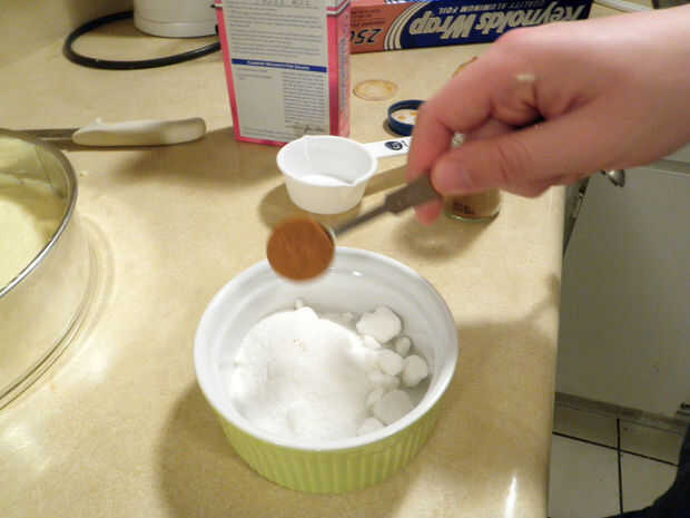 En un tazón pequeño, combine 1/2 taza de azúcar con una cucharadita de canela molida. Espolvorear esta mezcla sobre las manzanas.