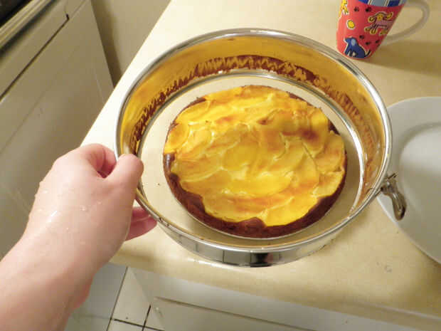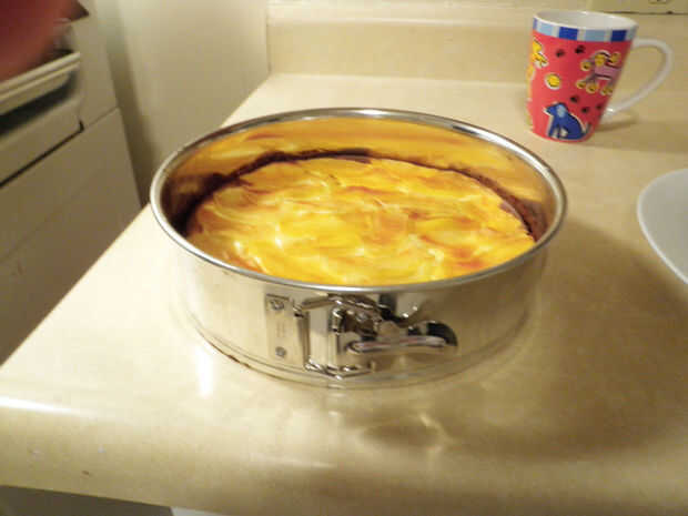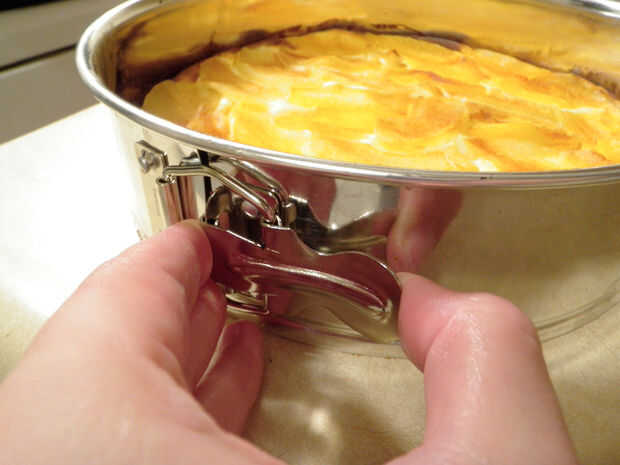 Liberar el cheesecake de la springform y permita que se enfríe por un tiempo más largo. Cuando se trata de a temperatura ambiente, cubierta en papel aluminio o envoltura de plástico y pegarlo en el refrigerador durante la noche para resolver (o para una buena parte del día).