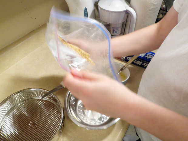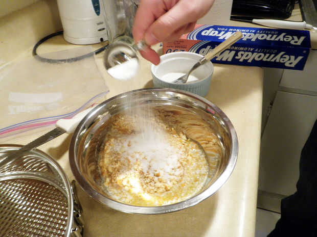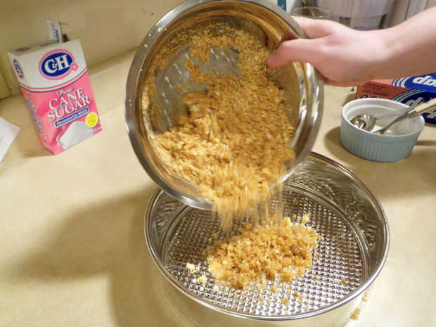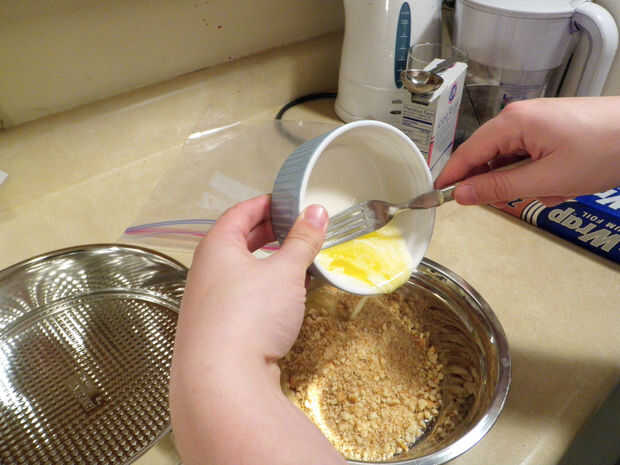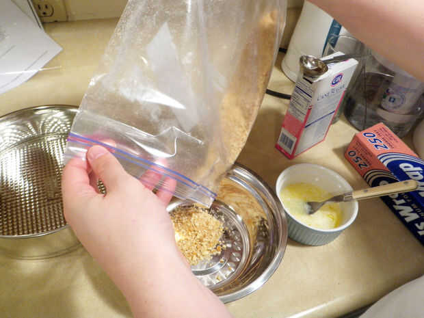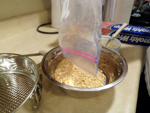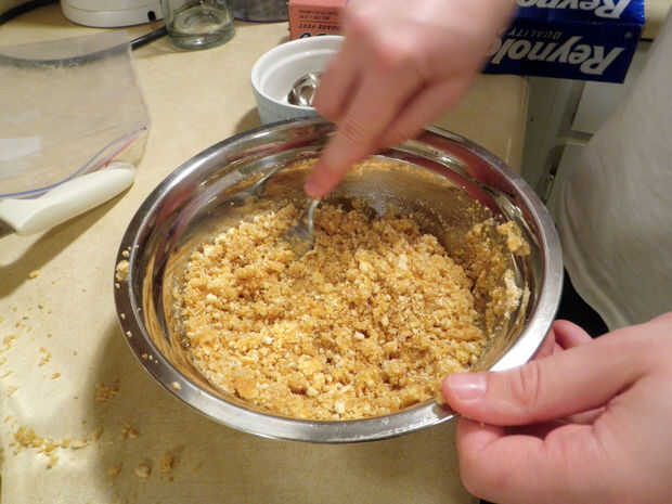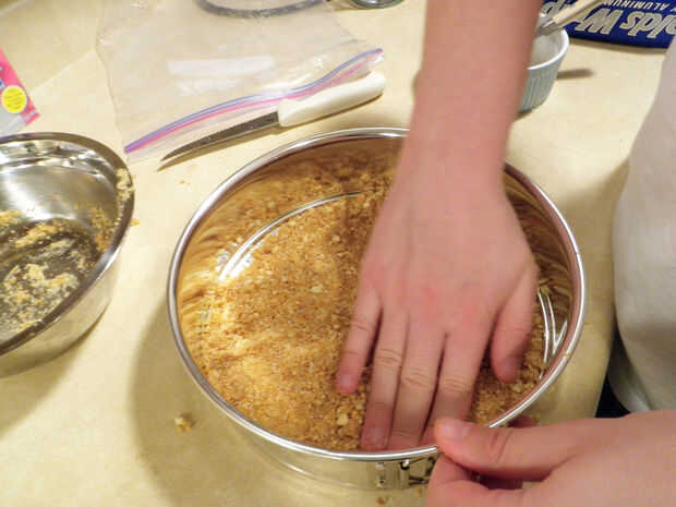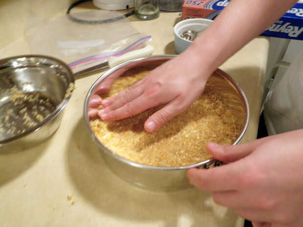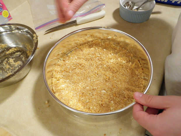 Distribuir uniformemente las migajas en el fondo de su molde springform de 9". Paquete hacia abajo con la mano.
